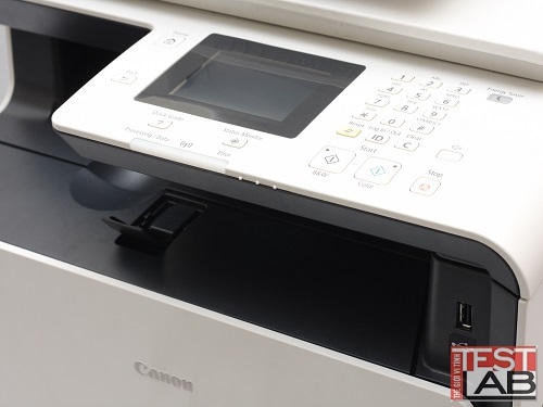 Như đã đề cập, máy in Canon imageCLASS MF628Cw có thể hoạt động một cách độc lập mà không cần kết nối với máy tính. Để đáp ứng việc này, phía trước máy có cổng USB cho phép kết nối thiết bị lưu trữ USB để in trực tiếp hay lưu trữ tài liệu quét.