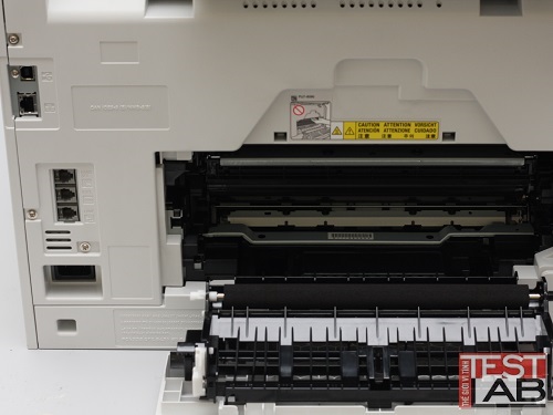 Các cổng giao tiếp và nắp xử lý kẹt giấy phía sau.