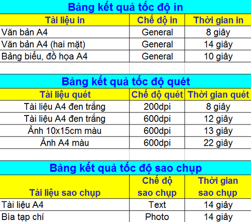 Bảng kết quả đo tốc độ in, quét và sao chụp của Canon MF221d.