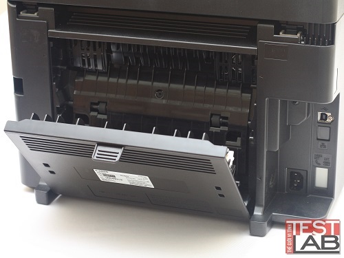 Phía sau may là cổng nguồn, cổng USB và nắp bật để xử lý các tình huống kẹt giấy